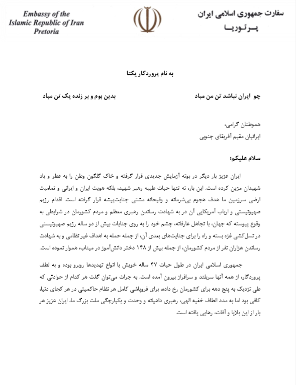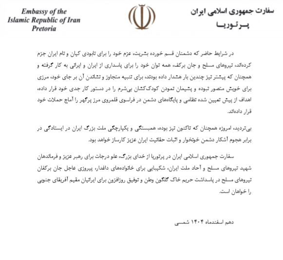 بیانیه سفارت جمهوری اسلامی ایران خطاب به ایرانیان مقیم آفریقای جنوبی